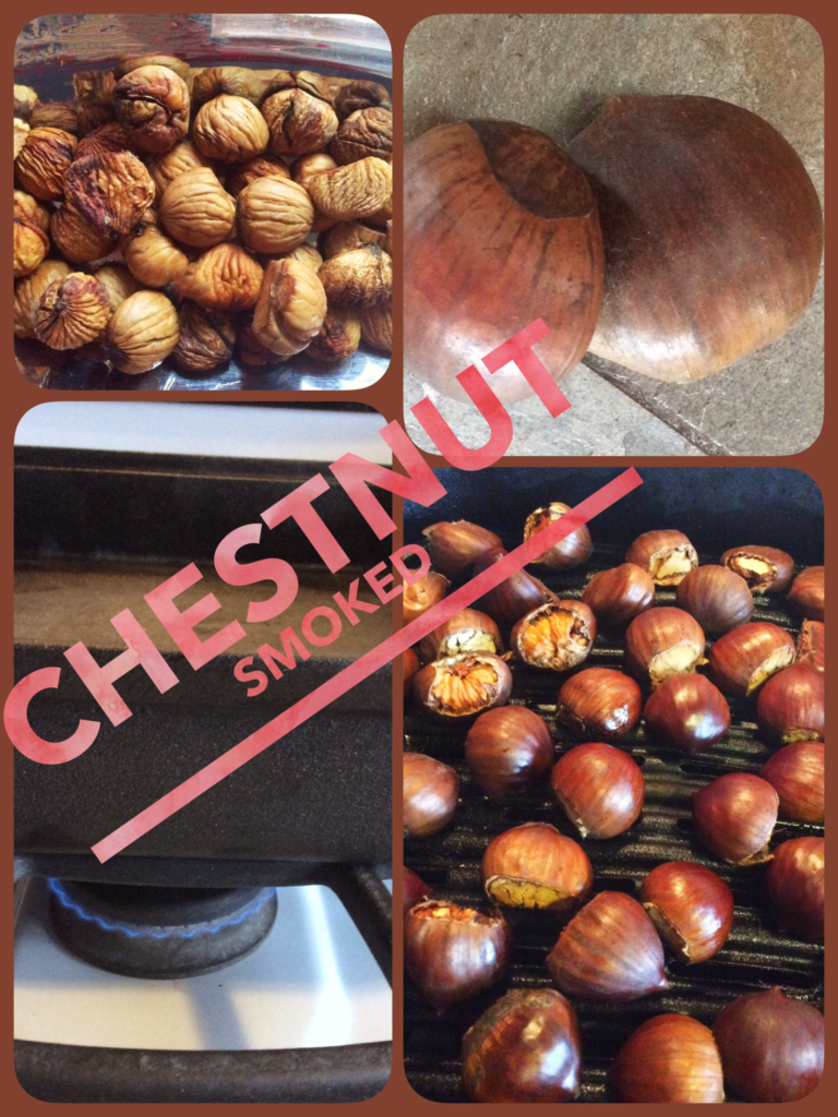 Collage of Smoked Chestnuts go on a Stovetop Smoker